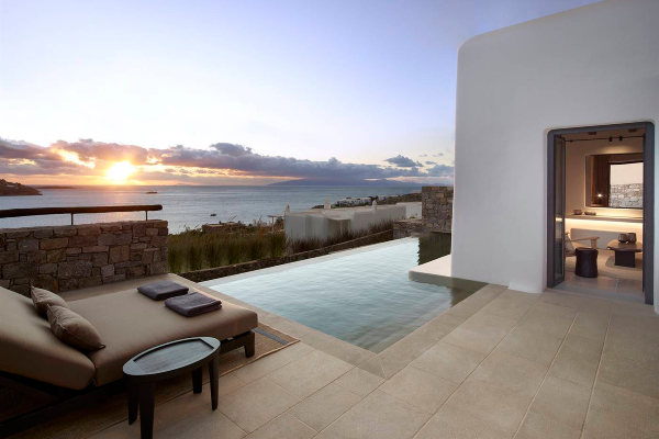 Set above Ornos Bay, Kalesma Mykonos offers a quieter perspective on the island, with whitewashed villas arranged to follow the natural landscape rather than dominate it. The setting feels removed from Mykonos Town, though still within easy reach.